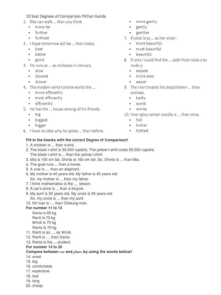 Soal comparative degree kelas 8. Kalimat di atas berbentuk comparative degree, sehingga kalimat lengkapnya menjadi she is prettier than her sister. Soal pilihan ganda comparatives dan superlatives. Contoh soal degrees of comparison (positive, comparative, superlative) dan jawabannya: Contoh soal pilihan ganda untuk materi degrees of comparison choose the correct answer for the . 10 contoh soal superlative degree adjective pilihlah superlative form. Kumpulan soal 'comparative adjective' beserta jawaban dalam bahasa inggris lengkap hanya di kbi ( kuliahbahasainggris.com ) Rita can walk … than you think. Contoh soal passive voice pilihan ganda dan essay beserta jawabannya a. Karena heaviest merupakan superlative degree yang artinya "paling". Karena kalimat di atas memiliki pilihan antara "iron atau lead". Email thisblogthisshare to twittershare to facebookshare to pinterest. Untuk lebih jelasnya, berikut adalah soal latihan tentang comparative and superlative adjectives dan comparing quantities beserta kunci .