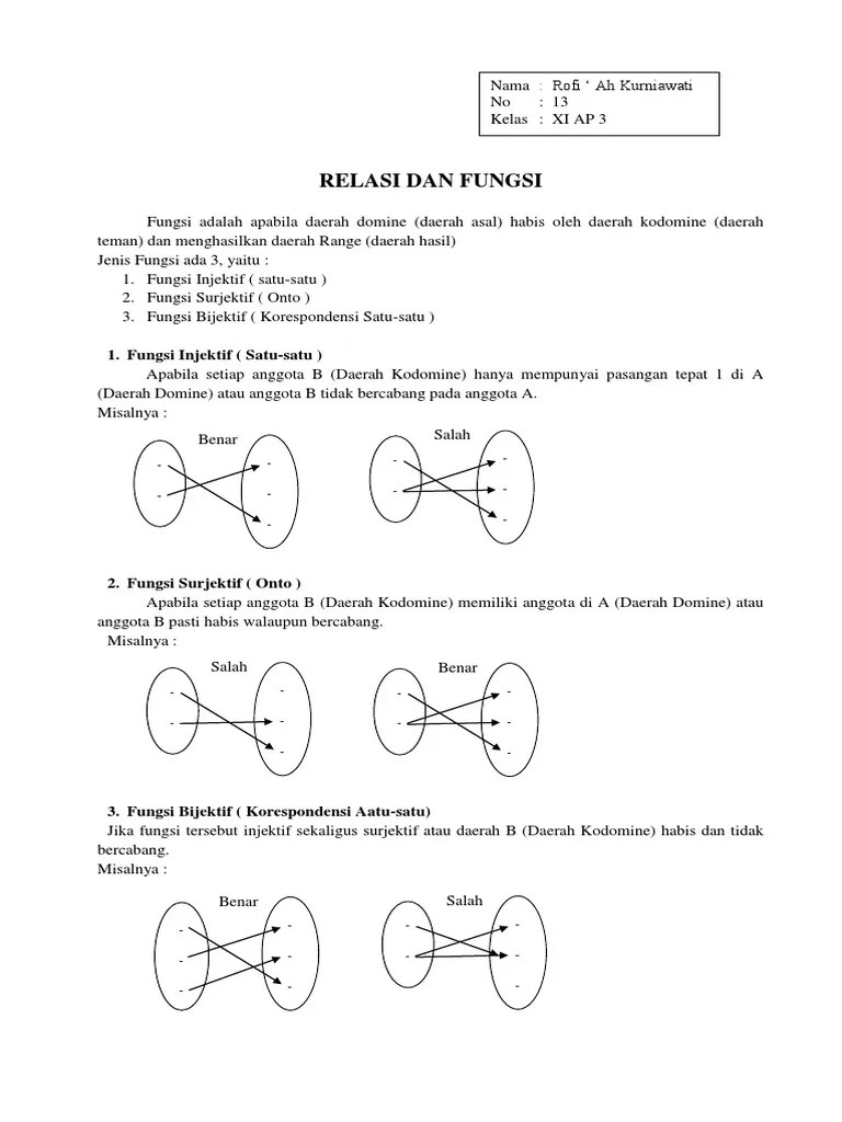 Fungsi bijektif dari suatu himpunan ke dirinya sendiri disebut permutasi dan himpunan semua permutasi dari suatu himpunan membentuk sebuah grup simetris. Jika suatu fungsi f : Fungsi surjektif merupakan fungsi yang daerahnya merupakan hasil dari sekelompok teman, yang artinya setiap anggota di daerah teman, mempunyai . A → b disebut fungsi kepada, fungsi onto atau fungsi surjektif jika dan hanya jika untuk sembarang b dalam kodomain b . Apakah fungsi dari r ke r ini g(x) = x+5 merupakan fungsi injektif? Diketahui f left parenthesis x . Fungsi f dikatakan surjektif (surjective) atau pada (onto) jika setiap elemen himpunan b merupakan bayangan dari satu atau lebih elemen . A→b sedemikian hingga f suatu fungsi yang surjektif dan injektif sekaligus. R → r dengan f(x) = x2 merupakan fungsi surjektif?